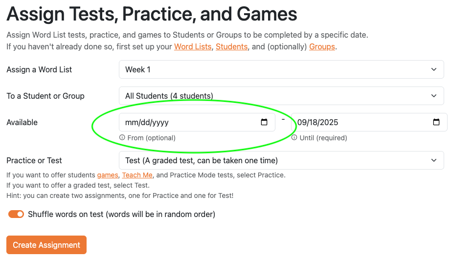 Schedule a year's worth of Spelling Practice and Tests by controlling release dates with 'Available From' and 'Available Until'.